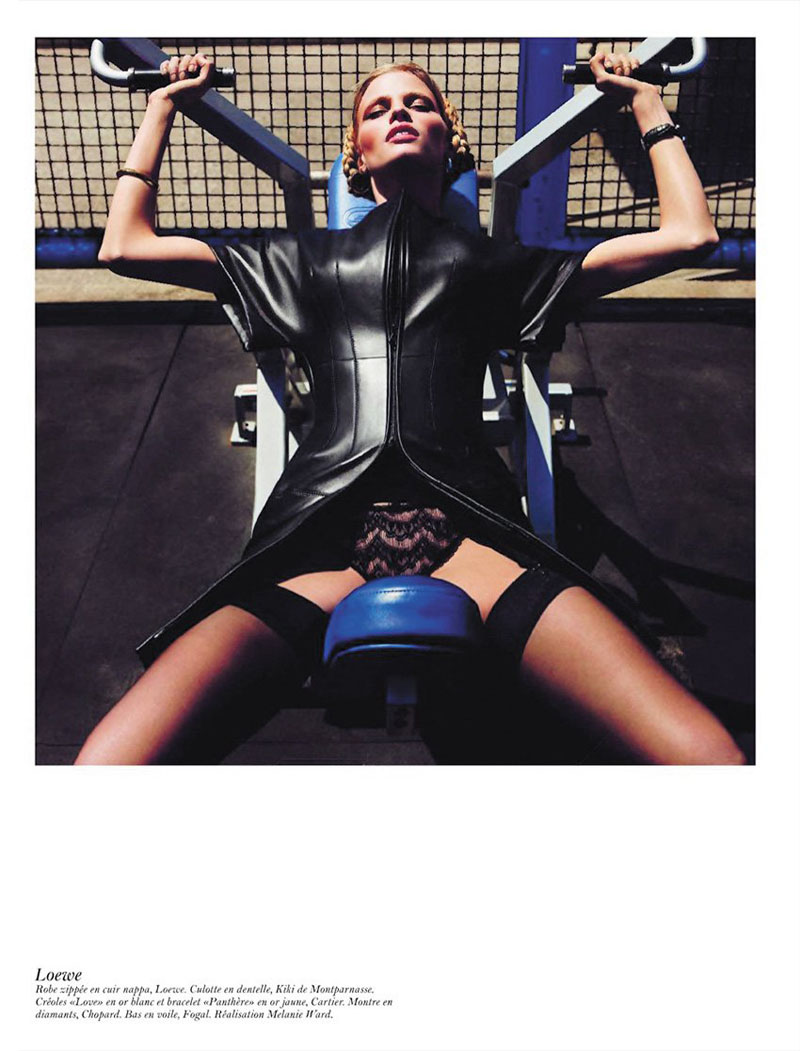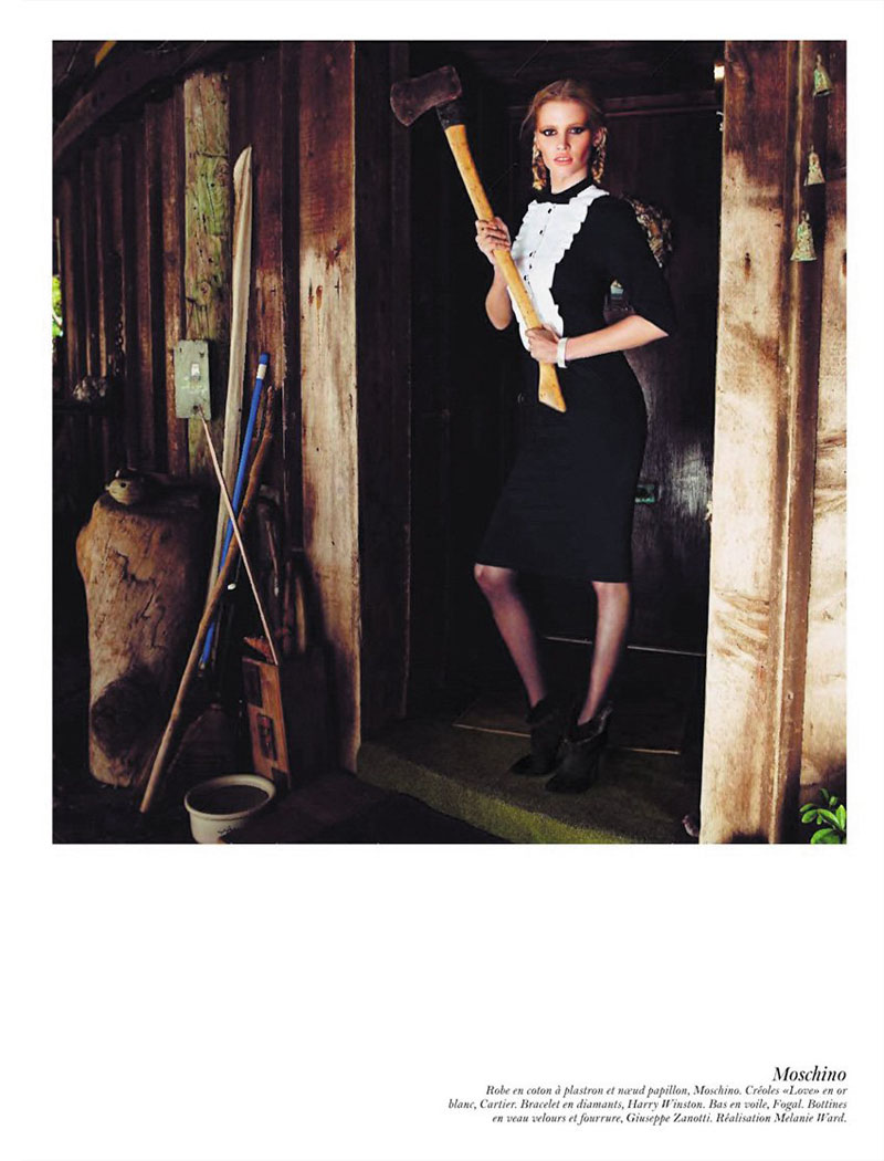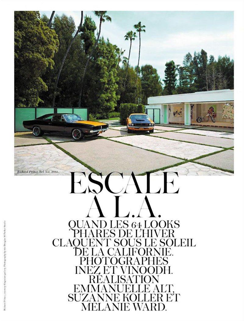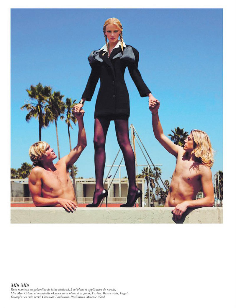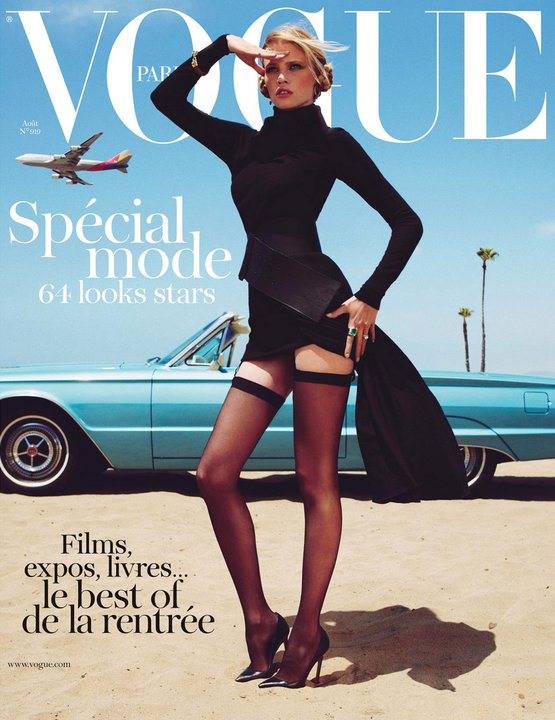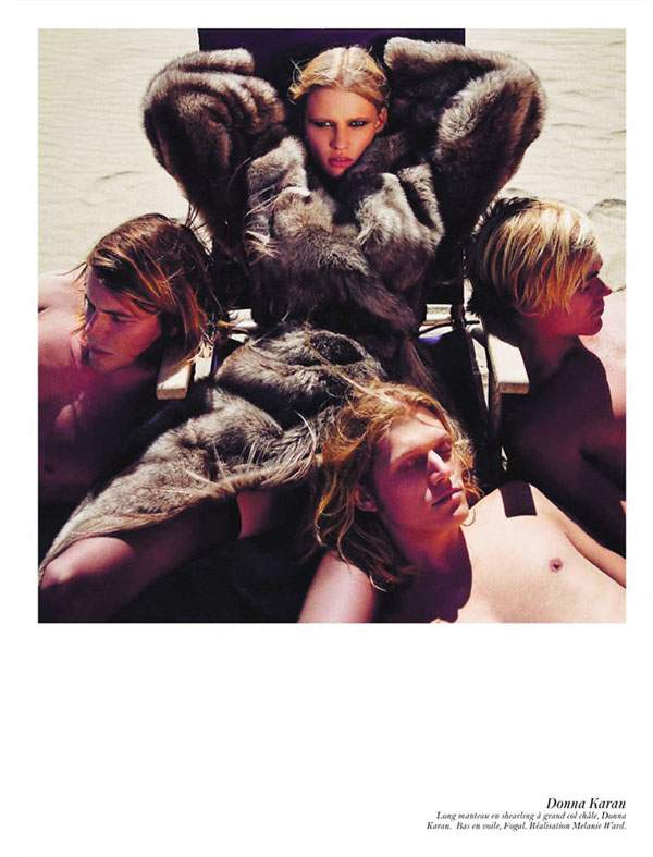 Para Newton, un cielo azul, una rubia escultural, un aparcamiento o una terraza eran suficientes. Una verja y un abrigo de piel. Una mujer desnuda y una cocina. Un gorro de piel rusa y un oso. Un zafiro muy azul y un pollo. En el primer número de Vogue Paris con absoluto control de Emmanuelle Alt, la sucesora de Carine, y una firme contribuyente al look desarrapado-lésbico-rock-ja de las Voguettes (llevado en ella al último eco de ese grito en el vacío, claro) vuelve al pasado glorioso de Vogue Paris cuando Newton era el sheriff e incluso a un poco de sus trabajos propios como aquel en que Daria se paseaba vestida de Chanel por Los Ángeles… Aunque aquí hay más perversión y menos laissez faire…