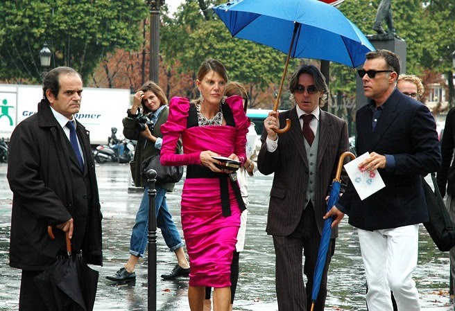 Anna Dello Russo o la fashion victim. Al menos es divertida. Como quien dice. Se pone total looks sacados directamente de la pasarela. Es decir, cuando toma contacto con las pasarelas en septiembre y en marzo, no sólo toma parte con el contenido de su revista sino con lo que ella misma va a llevar. Cuando la preguntan cuenta anécdotas de su vida. Tiene dos pisos sólo para ropa. Se hizo unas cortinas con su vestido de novia ¿? y siempre, siempre, lleva joyas porque como saca lo que se pone directamente de la propuesta del diseñador de turno, quiere personalizarlo de alguna forma.