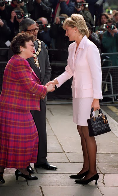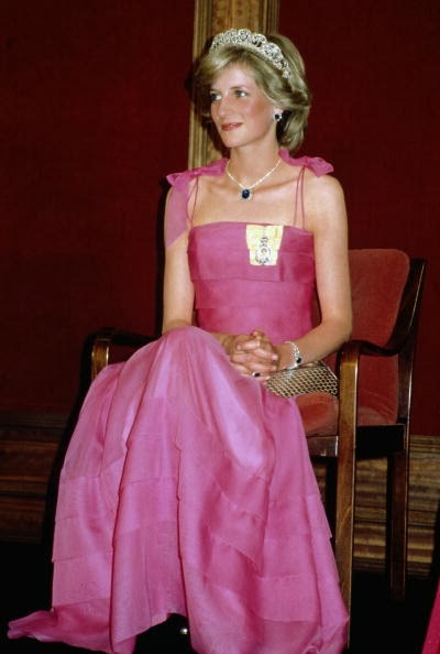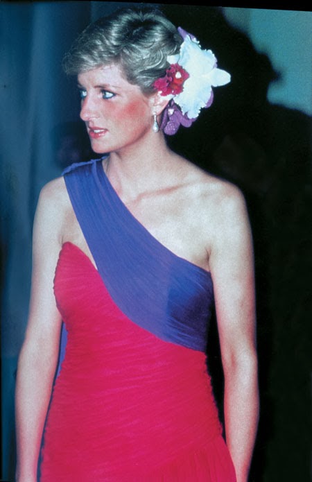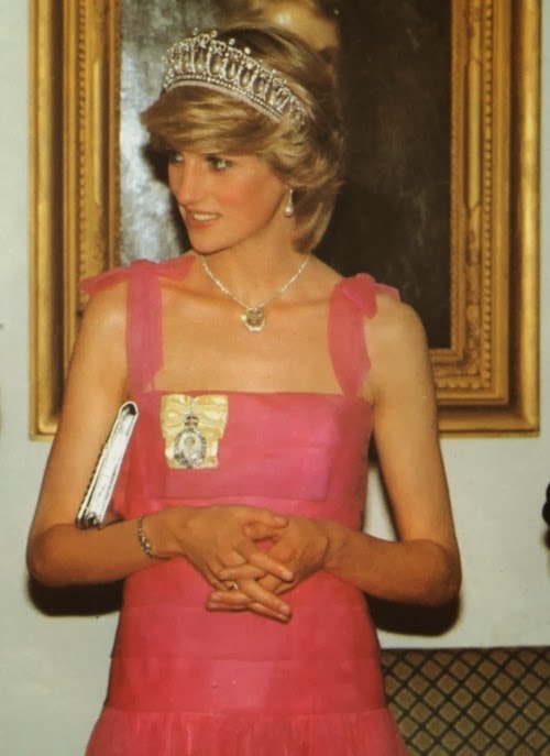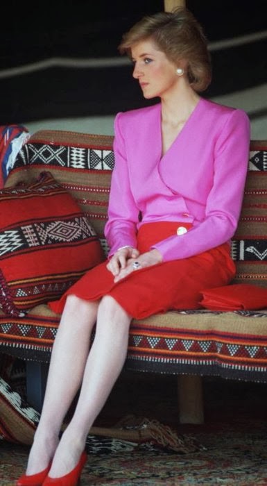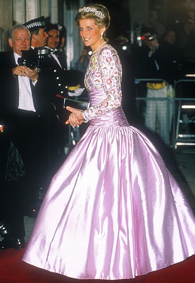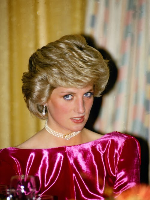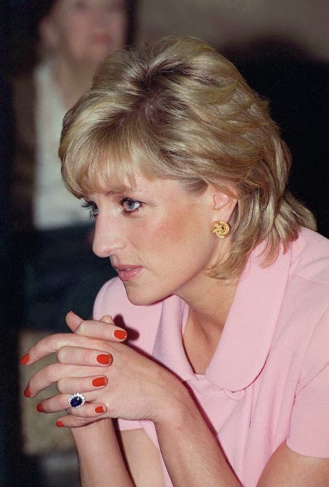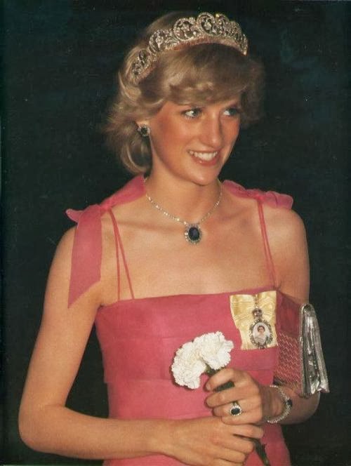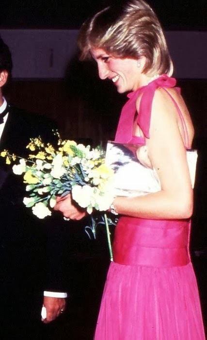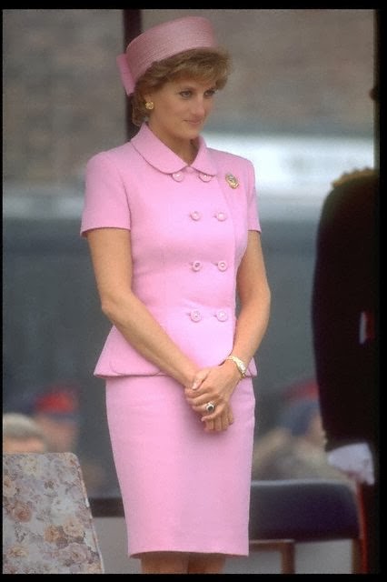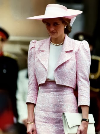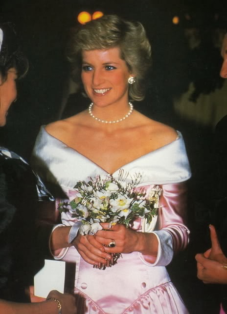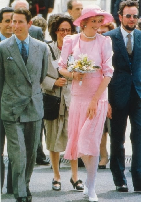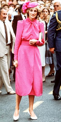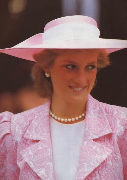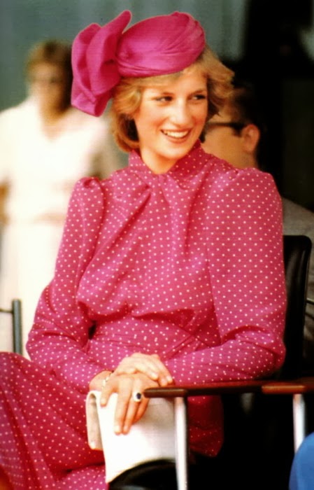 Sin embargo, es habitual ver a Diana de color rosa (quizá porque es el color de las princesas), además del azul (el tono estrella de Lady Di, aunque la historia la recuerde de blanco por su boda y de negro, bailando con Travolta, y con el Dior famoso -el jódete- tras su ruptura matrimonial) que, a mí me parece que le queda bien en sus tonos fuertes y no tan bien en los tonos pastel. Toda la vida, Diana tendrá esa tristeza frágil combinada con un egocentrismo digno de una estrella de los años dorados de Hollywood y una sonrisa, lo mismo fácil y deslumbrante, que tierna y cohibida. Me gusta mucho Diana, porque es una mujer frágil y fuerte a la vez, porque es todo un icono de moda -y bastante pop, además- y porque -pese a lo mucho que gusta a las marujonas- le quedan bien las joyas, los lunares (la imagen más bonita, a mi entender, es la primera) y porque me parece muy dulce.