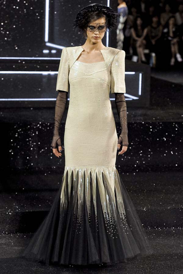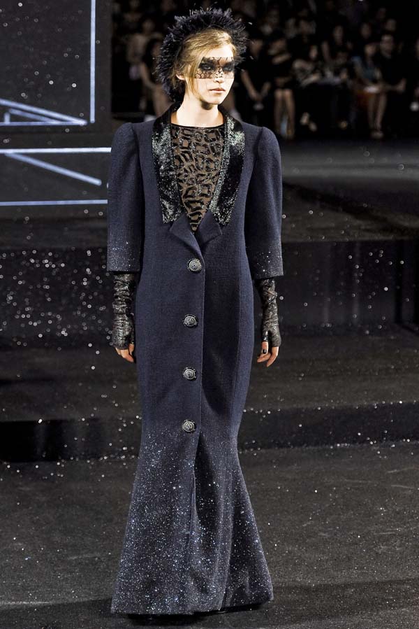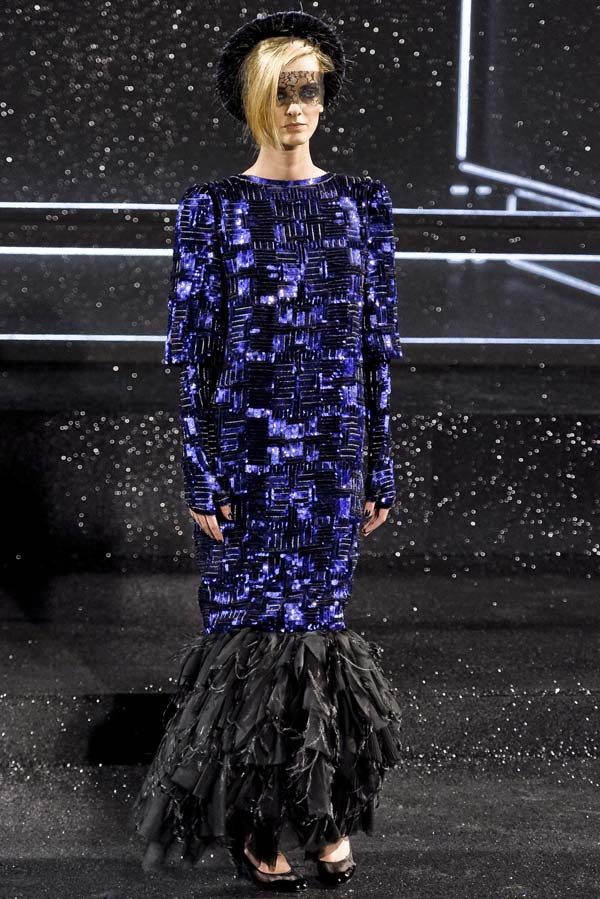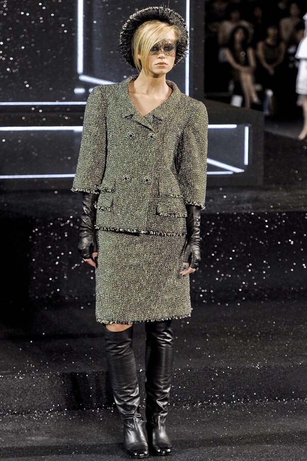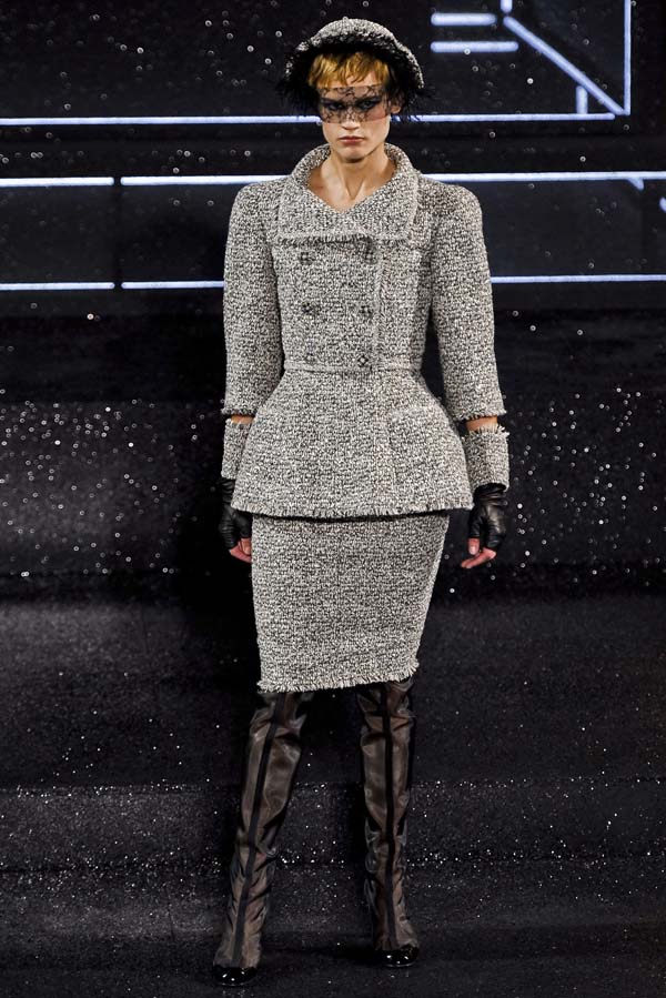 Lagerfeld repasa -y examina- las tribulaciones de la mujer moderna que pasan desde el primer canotier pequeño, delicado, áspero de Coco Chanel hasta las mangas acuchilladas que permiten libertad de movimientos que también inventó Coco y las proporciones algo deformadas que estilizan la figura de forma extrañamente masculina. El Kaiser continúa con su oda a la modernidad paradójica con las botas a lo “mod” de Courreges, y prosigue con modelos para la noche basados en el cielo y en las aspiraciones.