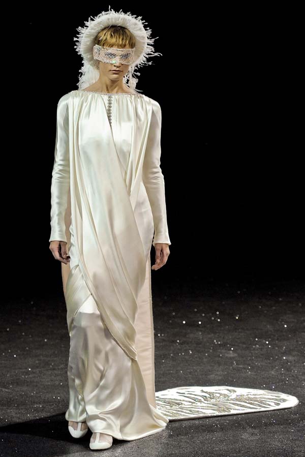 Porque la meta del desfile, de la contemporaneidad, de la antiguedad, es, al fin y al cabo: la belleza. las siluetas desconcertantes, las melenas que se convierten en enjambres de seda, las máscaras que ocultan nuestro verdadero rostro, los opresivos abrigos cerrados de cuello a pies que envuelven como una crisálida a la mujer de Chanel dan paso a transparencias, tejidos que fluctúan bajo las luces, que se deshacen como si fueran de agua, a flores en el pelo, las mangas largas y los escotes cerrados se rompen y pasan a ser plumas de cisne que acarician las dulces mieles femeninas y que reclaman amor y caricias para esas sirenas… que buscan un marinero para casar bajo la potestad del capitán porque, amigos, el vestido blanco y la sonrisa, ya los tienen.