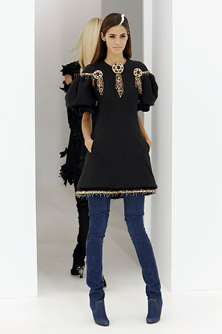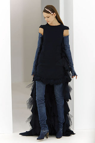 Y Lagerfeld demostró no sólo que el vaquero puede ser elegante -eso no es ninguna sorpresa sin embargo, veo todos los días magníficos ejemplos no solo de la versatilidad del vaquero, de lo chic que puede ser (y también de lo espantoso claro)- sino que podía ser lujoso más allá de añadir como llevaba haciendo Roberto Cavalli ya unos cuantos años. Los cortes de la colección eran perfectos, los accesorios, en los que Lagerfeld suele desmadrarse y proponer o bolsos-cubito de hielo (!guays!) o zapatos-pistola-condicional (ugh), virgencitas con la cabeza llena de papel o novios metálicos y con cabeza de león, eran sobrios y exquisitos, las horquillas de perlas eran deliciosas, los zapatos repujados y dorados, soberbios, los mitones, divinos.