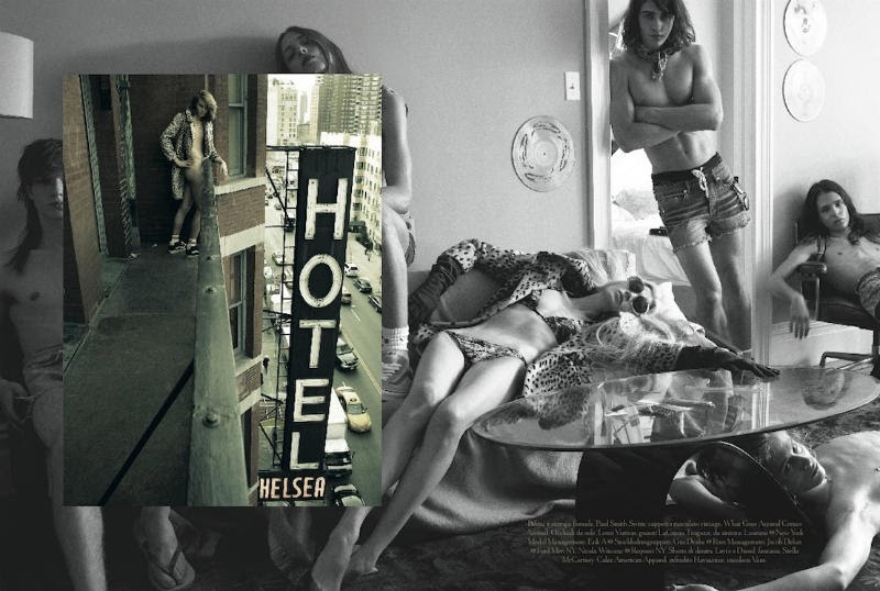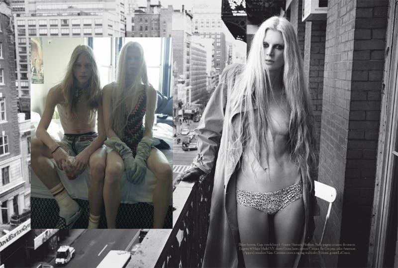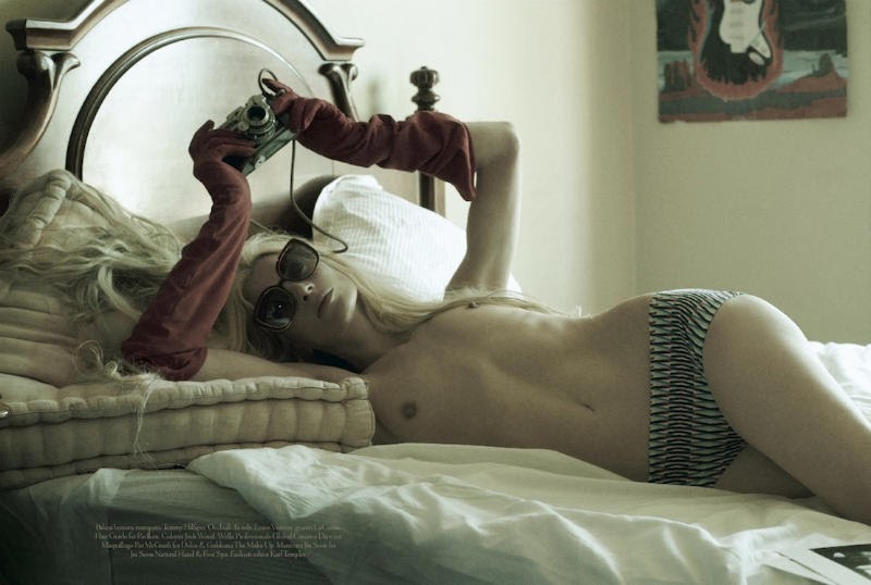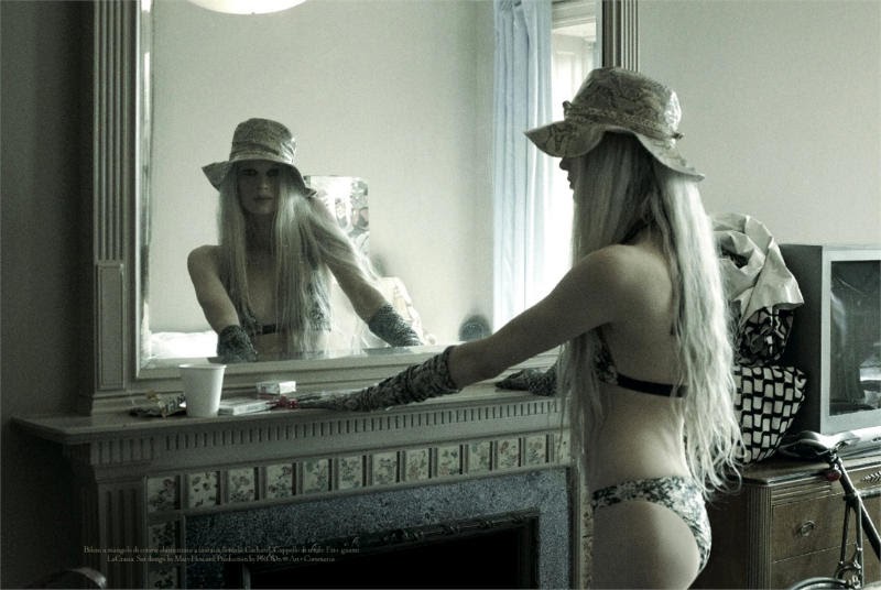 O el estrambótico Meisel… presentan un raro número de bañadores en blanco y negro, con una sex symbol de pelo gris, lejos de playas y en una habitación que roza el límite entre el Huerto cerrado y lo profanamente pervertido y vaciado. Pero no es sólo eso. No es sólo que sonrisas no haya, ni chicas facilonas, ni parte del unvierso mental de Terry Richardson, ni planos a lo Vogue USA con ¿Penélope Cruz? o Carmen Kaas con un bañador rojo y el sol de cara cortando la respiración con la cadera haciendo de línea del horizonte. No. La cuestión son los guantes azules.