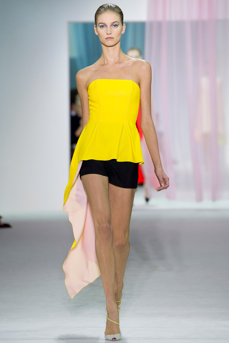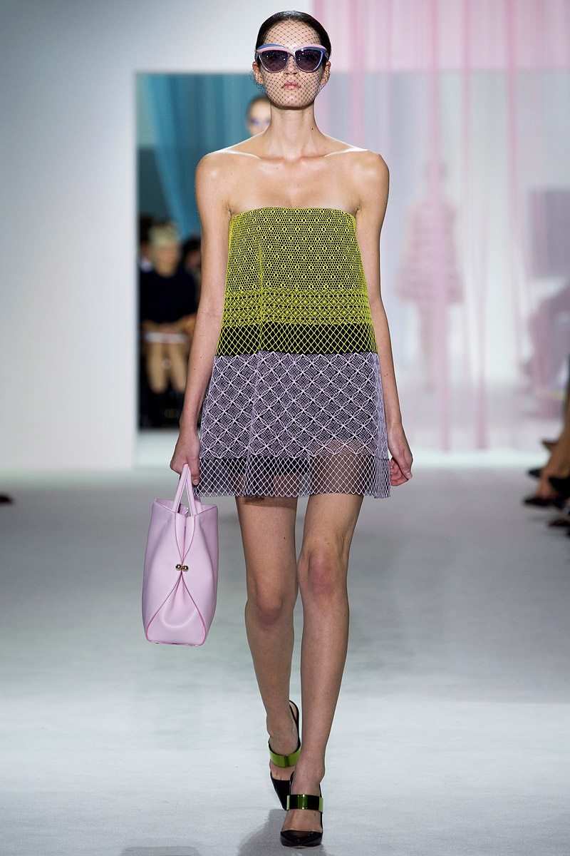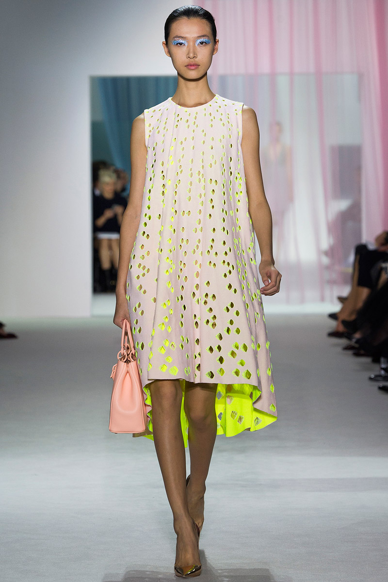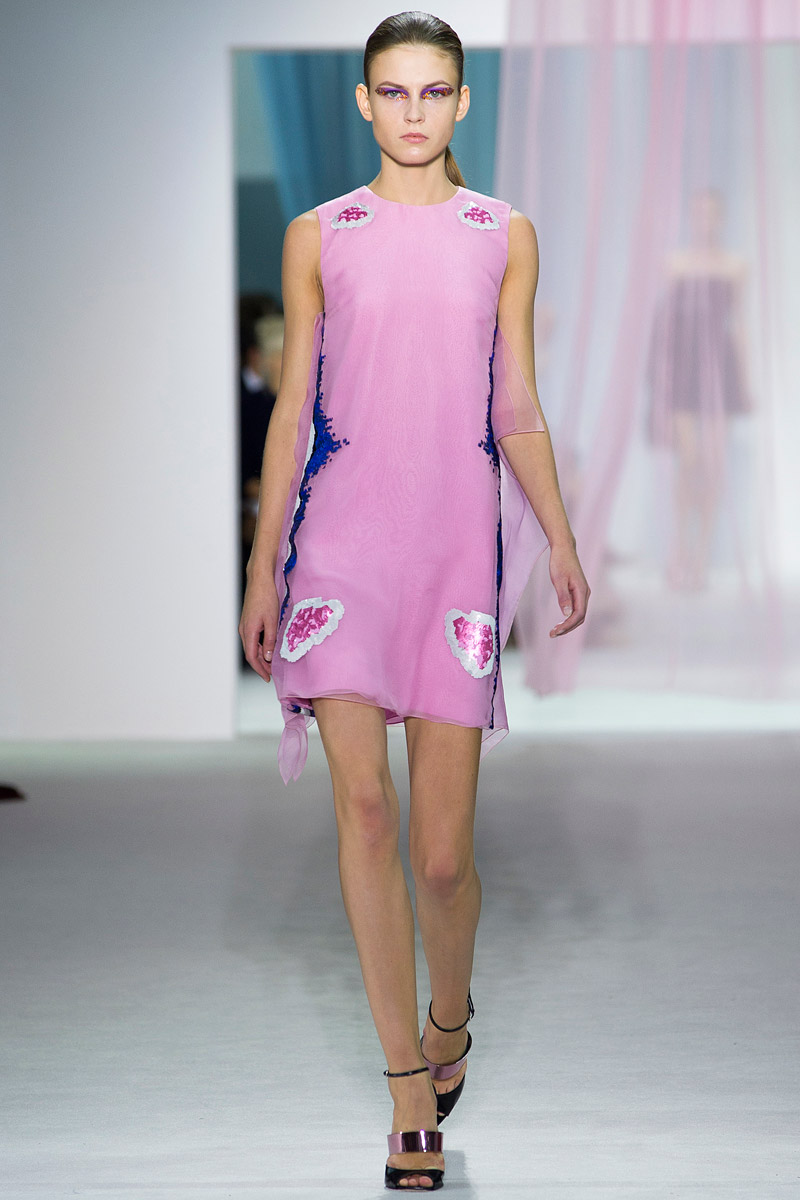 Simons se suma, por otro lado, a las tendencias de la temporada de calor de 2013 con una colección más primaveral que veraniega quizá porque es más glamuroso que haga “bueno” que que haga “calor“. Como Marc Jacobs o Dries Van Noten, a Simons le interesan las rayas del optical art –Op Art– y los tejidos sintéticos lo que hace que la colección tenga un regusto a los años 80s de forma inevitable aunque no evidente. El fin de la colección evidentemente son vestidos de baile, no largos porque parece que ese cliché aburre a Simons. Y, para compensar el ambiente tecnológico de su nylon iridiscente, escoge pintar a mano las rosas cincuenteras que añade a sus diseños.