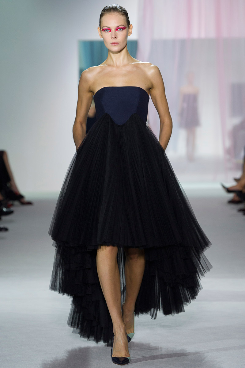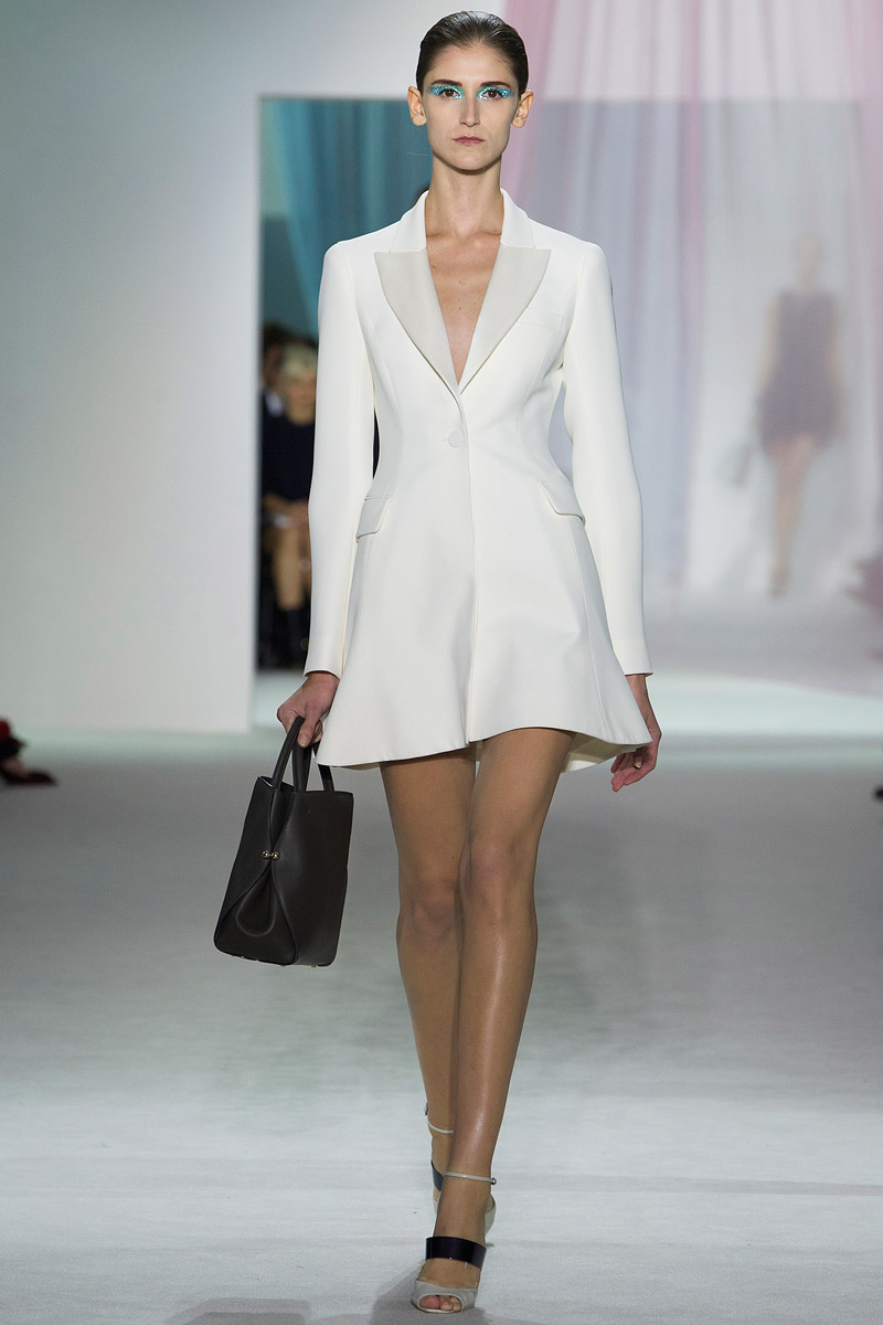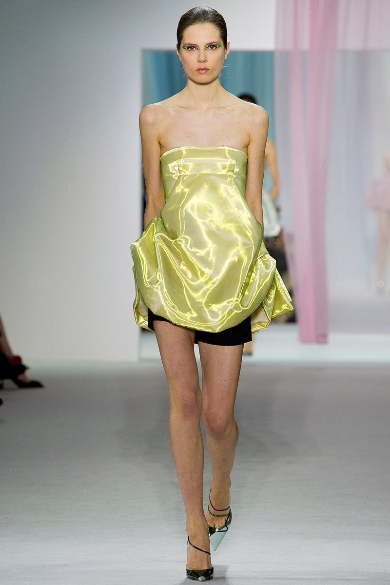 Los trajes cortos para la noche son muy atractivos, especialmente los que tienen aplicaciones que los hacen brillar y cambiar a medida que las modelos caminan o las luces los rozan. Es una colección que sin duda trata el movimiento como un tema principal muy presente en todas las creaciones, desde las ideadas para la mañana como, especialmente, las que tienen un marcado acento “nocturno“. Así, minivestidos creados con costuras diagonales que dan al tableado gran movilidad, alas traseras de gasa que crean la sensación de que la portadora flota y cortes irregulares que se entrecruzan con las piernas al andar mostrándonos que el vestido que nosotros veíamos rojo es, en realidad, de forro rosa y, así, esa sorpresa, nos saca una sonrisa en los labios.