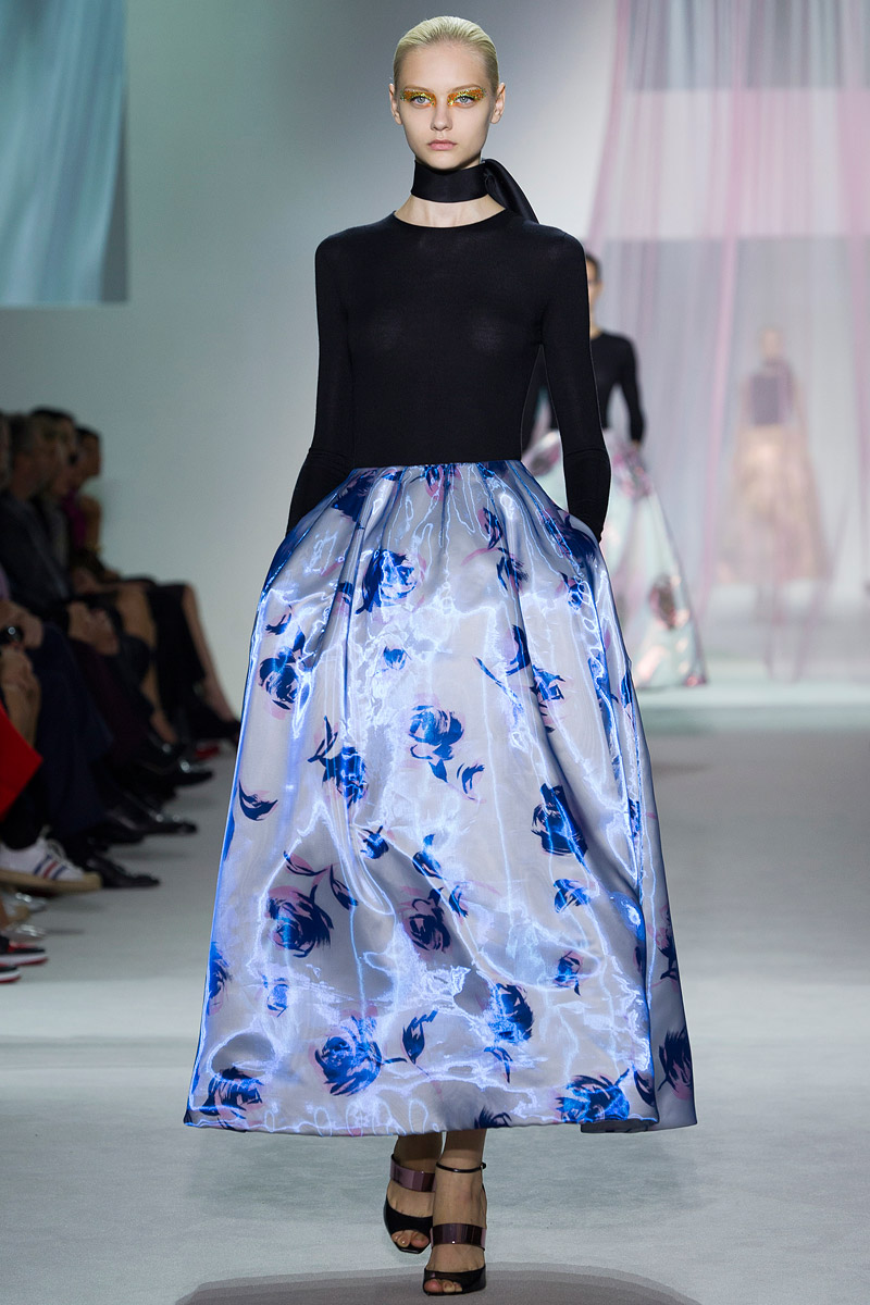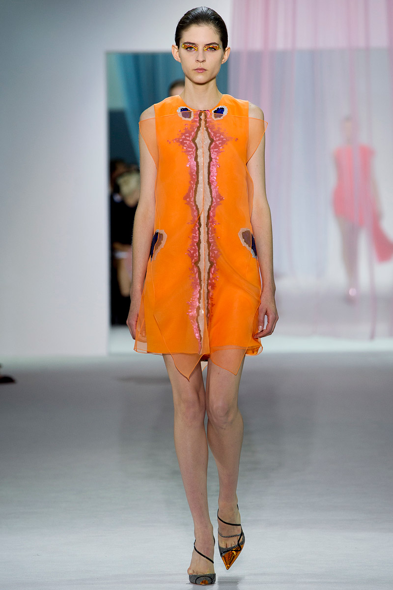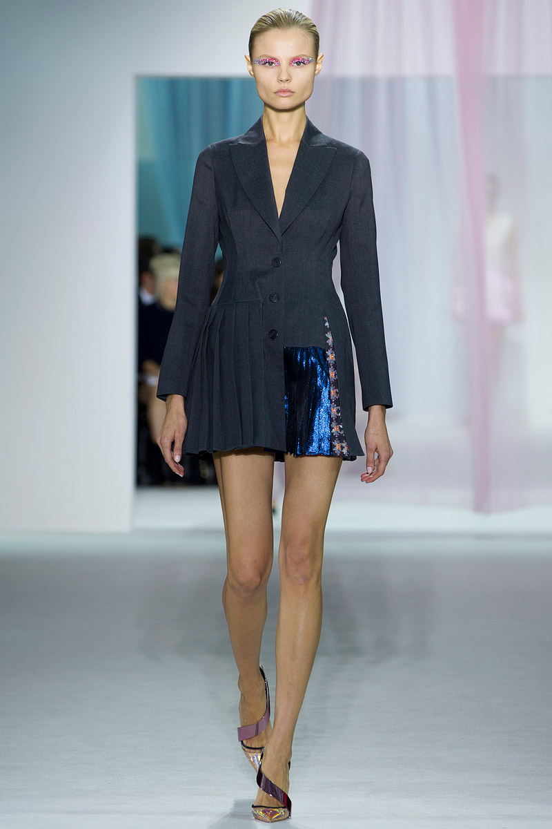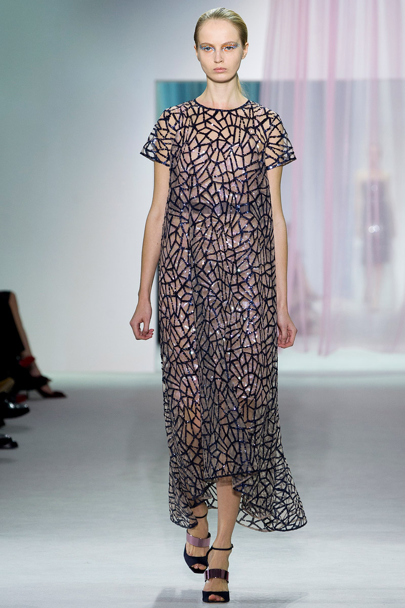 Realmente las siluetas no son sorprendentes. Karl Lagerfeld en Chanel ha presentado ya en otros veranos colecciones sobre la iridiscencia (por ejemplo su desfile de temática marina para el verano de 2012 donde cantó Florence Welch) y que ha desarrollado formas (tanto en Alta Costura como en PAP) que hemos visto en este desfile de Simons (vestidos más largos por detrás que por delante, con volúmenes de tul a la cadera para dar movimiento y americanas que se hacen minivestidos y que permiten enseñar pierna y pierna). Pero no sólo Lagerfeld ofreció esas siluetas, los vestidos de noche finales, con faldas acampanadas que acaban a media pierna y que se complementan con un cuerpo muy sencillo están -casi- calcados de la colección de ninfas y mujeres elfo de Prada deverano de 2008 y Armani ofreció iridiscencias en su colección de Alta Costura de invierno de 2011.