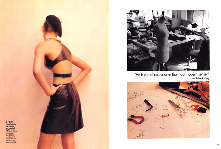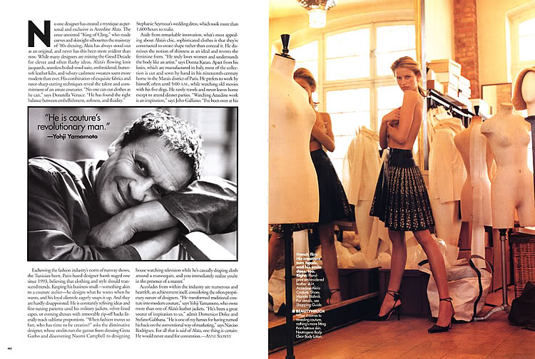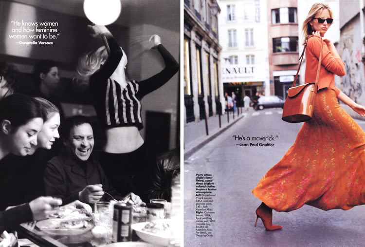 Alaia dijo una vez que su “obsesión” era “hacer cosas bellas“. Y lo hizo. “El toque maestro” es un editorial fotografiado por Gilles Bensimon, con la Kurkova, sobre una colección de invierno de Azzedine Alaia. Los 90s no fueron, lo que se dice, todo orégano. Sí, estaba Carolyn Bessette Kennedy por allí y también había propuestas maravillosas en el último Versace y en Chanel con Lagerfeld, Valentino y Saint Laurent pero, en concreto, estos tres últimos diseñadores caminaron hacia la cursilería en su carrera. Cabe destacar sobre todo a Prada pero hubo momentos de confusión en el recodo del milenio y de repente uno aparecía en una alfombra roja con vaqueros y una blusa blanca y a todo el mundo le parecía bien. También coleaba o vivía vivo el grunge, así era la primera colección de Marc Jacobs que le llevó a ser el diseñador que hoy conocemos, pero lo que más me gusta de los 90 es que hay una especie de belleza natural que a veces revolotea por las producciones y que nada tiene que ver con la afectación de antes de la II Guerra Mundial, el optimismo de los 60 o los 70 con su psicodelia -y esquizofrenia pop- ni con la omnipotencia de los 80 y sus supermaquillajes, supercardados, superhombreras y demás. Y por eso me gusta.
