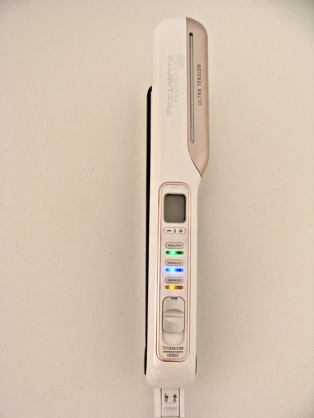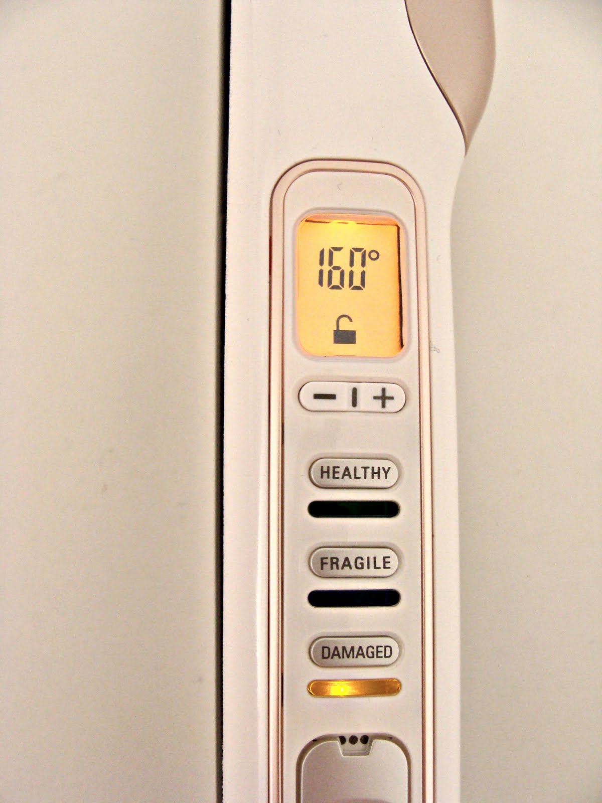 Puedes seleccionar cualquiera de las tres opciones: healthy (saludable), fragile (frágil) o damaged (dañado). La temperatura se ajusta a la opción escogida y si subes la misma, una luz roja te avisa del peligro que supone para el pelo (como si de un semáforo se tratara). Cuando se enciende la plancha, los tres colores se activan en modo intermitente hasta que seleccionas uno.