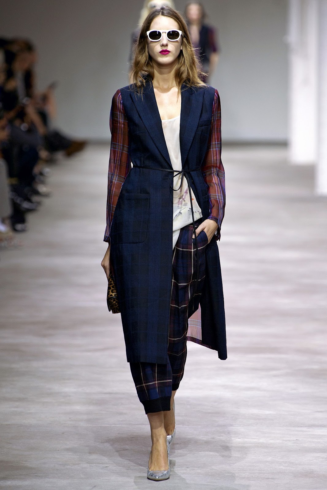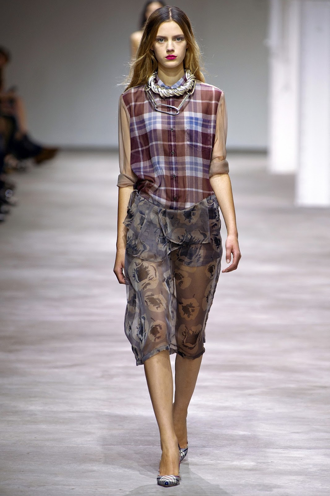 La colección que Van Noten presenta es muy interesante. Los estampados, que son su punto fuerte, establecen un diálogo con las prendas cuya base es el tejido, la textura. Las camisas de cuadros que podrían salir de los bares de carretera de la América profunda del medio Oeste no son bastas sino etéreas, confeccionadas en seda y en gasa hasta el punto de que flotan y ondean sobre el cuerpo de la modelo. Y, precisamente ése, el estampado de cuadros es el leit motiv de la colección.