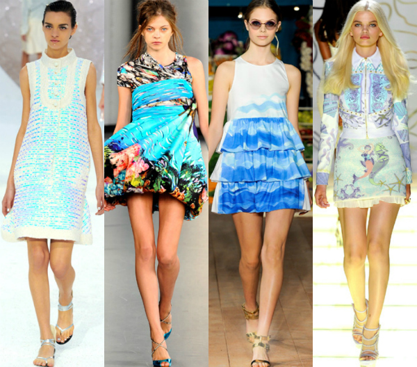 Cual sirenas, las pasarelas nos acompañan en un viaje subacuático. Texturas tornasoladas, estampados con motivos marítimos, y tonos azules y verdes que se mezclan entre sí.