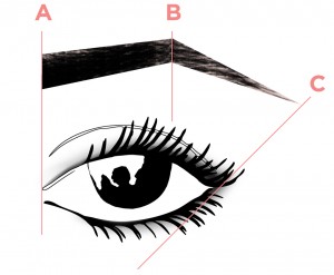 Lo de los palitos es para estudiar la forma. En la posición A, se coloca el palito recto en la aleta de la nariz y cuando llega a la altura de la ceja, indica dónde debe comenzar la misma (si sobran pelillos hay que quitarlos y si faltan, lo más difícil, hay que dejarlos crecer). La letra B indica que el palito debe estar recto a la altura de la pupila, de manera que ahí debe ir el arco de la ceja (en caso de querer darle forma). En la letra C, se coloca el palito de forma diagonal partiendo de la aleta de la nariz, formando un ángulo de 45º aproximádamente; ahí debe finalizar la ceja.